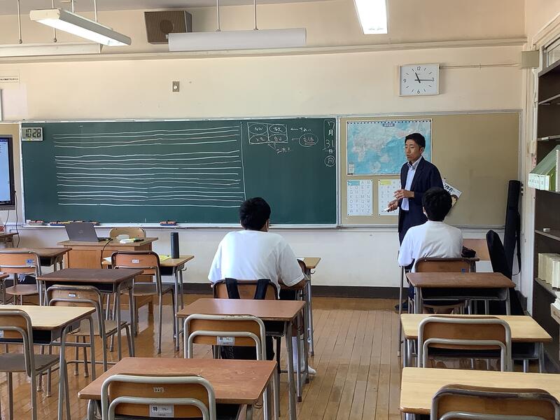 2年生の夏休みの課題の1つに「社会を明るくする運動」の作文コンテストがあります。これは、日常の家庭生活や学校生活の中で、体験したことを基に、犯罪•非行のない地域社会づくりや犯罪•非行をした人の立ち直りについて考えたことなどを題材として、作文にするものです。この作文執筆に向け、保護司の方々をお招きして、動画を観るとともに保護司の役割などについての講話をしていただきました。