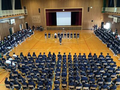 11日の1時間目には、全校生徒を対象に、生活指導主任の嶋村先生から学校生活のきまりごとについての確認があった他、朝礼隊形の並び方の練習がありました。生徒は、皆しっかりとした態度で参加していました。