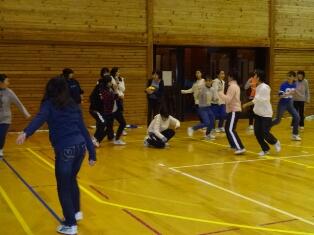 実習後、宿舎にもどり、入所式が行われ、生徒代表采女さんが「一人一人が自分の役割に責任を持ち、時間やルールを守ろう」と決意を述べました。夕食後、体育館で学年レクのドッジボールを行いました。