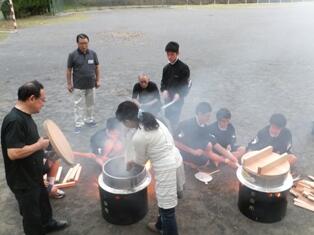 震災時の生活を想定し、避難所で自分たちがとるべき行動や態度、様々な防災講習から実践的な救命技術や防災の知識を学びました。夕食は、火起こしからはじめ、アルファ米・豚汁を食べました。飲み物は、水500mlのみで過ごさなければならず、災害時の食事の大切さを改めて実感しました。