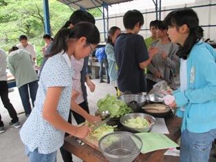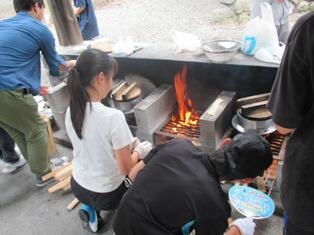 各班でメニューを決め、前日に買い出した食材を調理し、カレーやシチュー、牛丼などを作ったり、かまどに火を起こし、お釜でご飯を炊いたりしました。各班で力を合わせて作った料理は、どの班もおいしく出来上がり、ご飯もおいしく炊けました。あいにく途中から雨が降ってきましたが、バンガローの中で、楽しくおいしい昼食となりました。