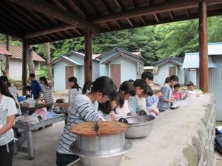 7月7日(火)、曇り空で雨が心配される中、1年生が校外学習で神奈川県の道志渓谷にあるこのまさわキャンプ場で屋外炊事を行いました。