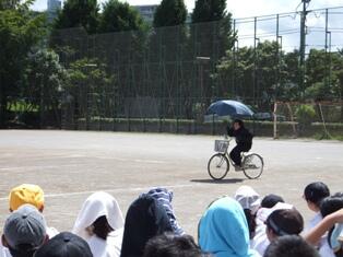 7月15日(水)5・6校時に校庭で、「スケアード・ストレイト」自転車安全教室を行いました。多摩中央警察署、プロのスタントマンの方のご協力により、「交通事故の恐ろしさ」や「交通ルールの大切さ」を学びました。
