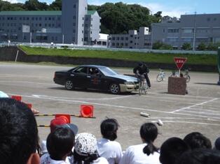 スタントマンによって「40kmで走る自動車と自転車との交通事故」「死角から自転車が飛び出した交通事故」などの場面が再現されました。ぶつかった瞬間の大きな音、スタントマンや自転車が飛ばされる様子に思わず声をあげる生徒も多くいました。再現現場に白バイがかけつけ臨場感を高めてくれました。