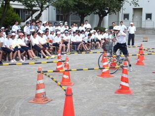 代表生徒8名が混雑した道路を想定した道や傘をさしての片手運転など危険な自転車の走行を実演し、その危険について学びました。
