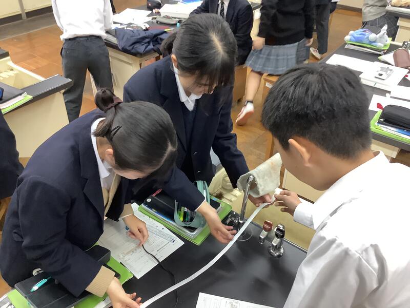 また、3年生の理科の授業では、運動とエネルギーに関する学習が行われていました。今日は、水平面上で移動する物体の運動を記録タイマーで記録すると、何がわかるか調べる実験が行われていました。さすが3年生、要領よく実験を進めたり、考察したりしている姿は立派でした。
