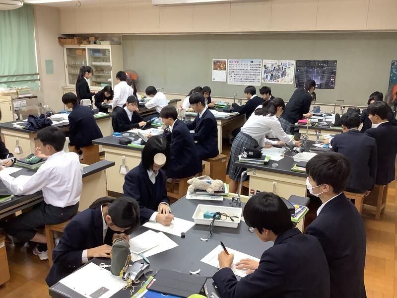 さて、1年生の理科の授業では、密度に関する実験が行われていました。質量と体積を測定し、その結果から密度を計算で求め、その数値から何の物質かを考察していました。班員が協力しながら、測定や計算、考察などに効率的に取り組んでいました。