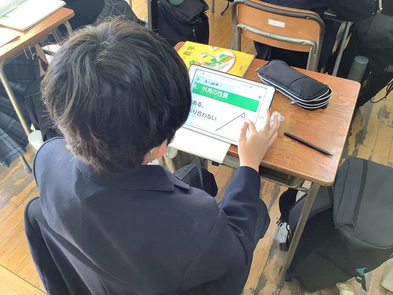 さて、2年生の数学の授業では、多角形の内角と外角に関する学習が行われていました。具体的には、内角の和の求め方や外角の和の特徴などについて考えました。デジタル教科書を使用したり、演習問題に挑戦したりする中で、性質の理解を深めたり、問題を解くコツを掴んだりしていました。