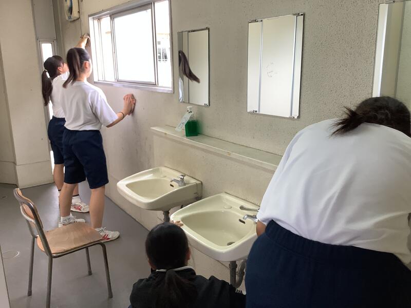 昨年度に引き続き今年度もトイレの壁をキレイに塗り替えることになりました。ボランティアを募ったところ、19名もの生徒が全校生徒のためになればと、自主的に参加してくれました。今日は、濡れた雑巾を使って拭き上げる作業でしたが、みんな嫌な顔をせずに、一生懸命取り組んでくれました。これで土曜日には、いよいよペンキを塗る作業に移れます。