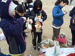 1月11日(月)早朝から、多摩第一小学校校庭に32名の多摩中生が集まり、ボランティアで「どんと焼き」のお手伝いをしました。それぞれの分担に分かれて、賽の神のくらの組み立て、持ち込まれたお飾りなどを分別、くらへの飾りつけ、餅花付け、消花の準備などの作業をしました。点火の11時には、たくさんの地域の人が参加する盛大な会となりました。