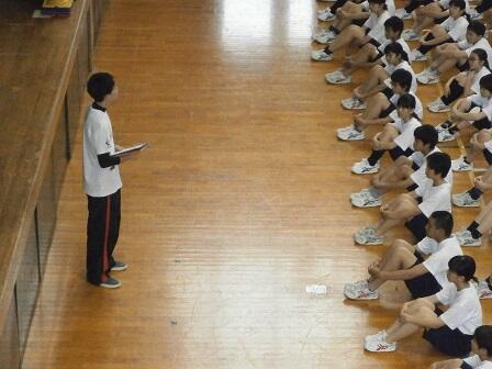 5月10日(火)4校時に第1回運動会練習を行いました。体育行事実行委員長、平井夕希菜さん、副実行委員長、安部裕貴君、新田先生のお話を受け止め、「熱い運動会」になるよう努力しましょう。この日は雨のため体育館を使っての練習でしたが、限られたスペースを活用し、ラジオ体操、行進の動きの確認など、充実した練習になりました。