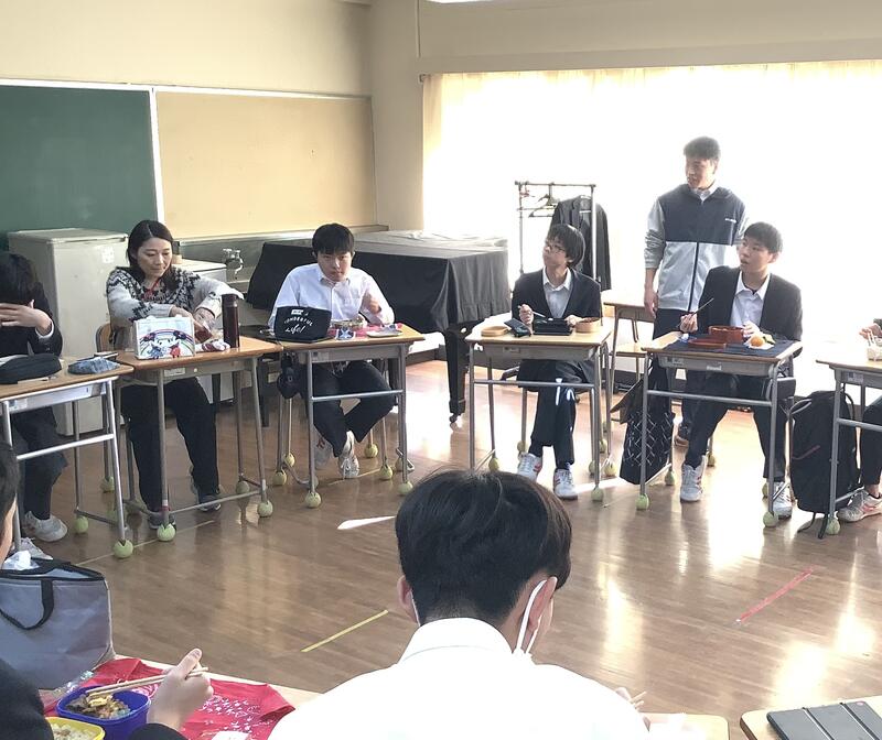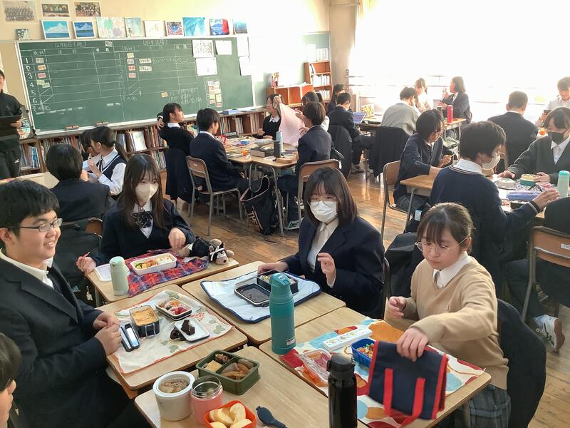 多摩中学校の伝統でもある自力de弁当の取り組みが行われました。生徒が自分で作ったお弁当で昼食を取りました。様々なお弁当が教室でお披露目され、日頃は給食を個々に食べていますが、今日は班になって楽しい昼食の時間となりました。