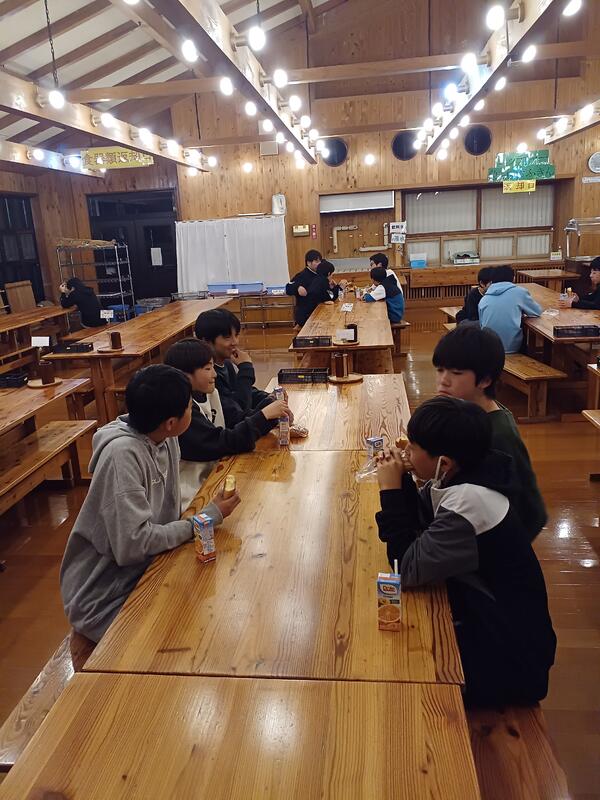 夕食後は、クラスごとに自由時間・風呂・夜食(クリームパンとオレンジジュース)。自由時間では、みんなホールに集まり、カードゲームに興じていました。なお、今日の配信はこの報告が最後になります。