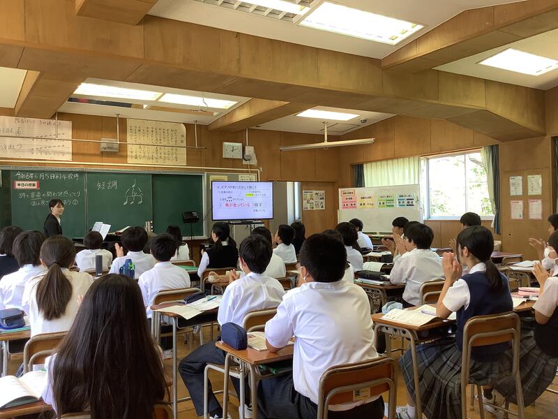 1年生の音楽の授業では、教育実習生が研究授業を行いました。シューベルト作曲の歌曲「魔王」の鑑賞の学習でした。作曲家の様々な工夫を味わいながら、曲の理解を深めることができました。