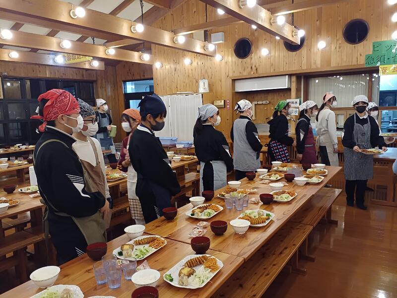 食事係の活躍のおかげで手早く準備ができました。今日の夕食のメニューは、オーブン焼きです。