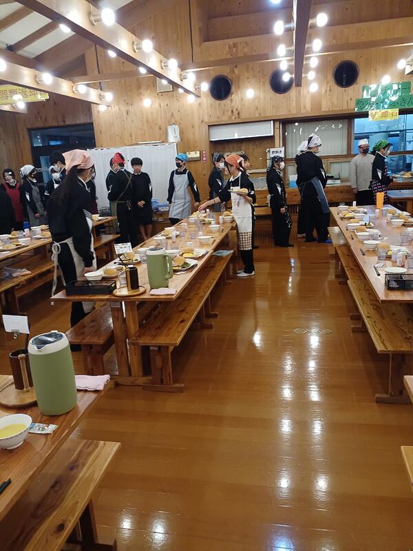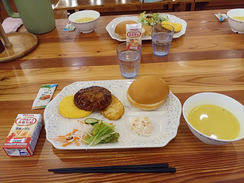 今日も食事係は大活躍です。今日のメニューは、ハッシュポテト・ハンバーグ・オムレツ・サラダです。