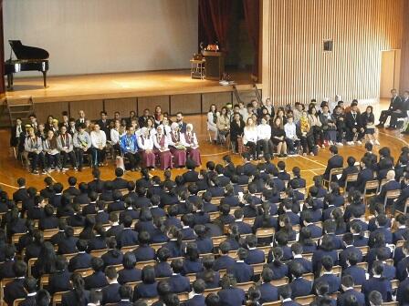19日に国際交流プログラムとして、13か国、14校の生徒が多摩中を訪れました。午前中は、歓迎の式として、映像による、各国の生徒たちによる自国の紹介と、多摩中なぎなた部の演技の紹介がありました。