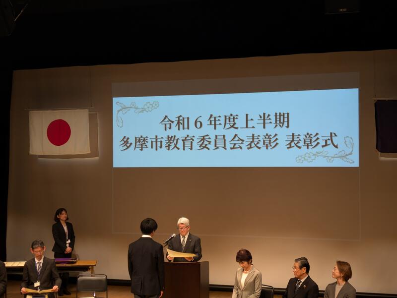 さらに、放課後にはベルブ永山のベルブホールで令和6年度上半期の多摩市教育委員会表彰式典が開催され、全日本中学校陸上競技選手権大会に出場した齋藤海翔さん(3年)が表彰されました。おめでとうございます。