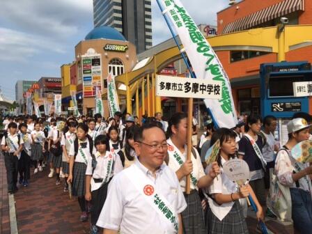7月18日(月)15:30~17:00に多摩センターで「第66回社会を明るくする運動」啓発パレードが行われました。当日は気温の高い中、多摩美術大学美術館前広場からパルテノン多摩に向けて、多摩中の生徒57名と教職員7名の合計64名がパレードに参加しました。全体では、900名を超える人が参加し、啓発運動を盛り上げることができました。
