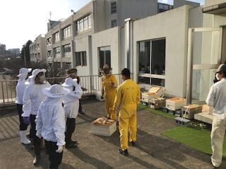チャレンジ部と野外活動部と地域の方が見守る中、桜が咲く前に新しい蜜蜂がやってきました。プロの養蜂家のお話を聞き、無駄のない手際の良さを見て、大いに勉強にたりました。防護服などの安全はもちろんですが、ラベルやネーミング、販路などこれから考えることがたくさんありますね。
