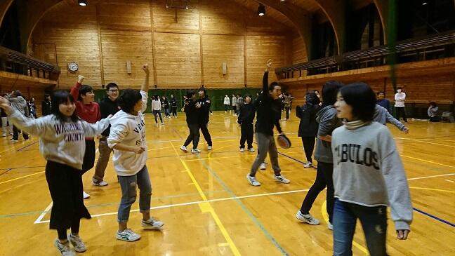 宿舎に帰って、夕食を食べ、宿舎の体育館でドッチボール大会を行い、盛り上がりました。その後、お風呂に入り、食堂で夜食のパンを食べながら、トランプなどを楽しんでいます。