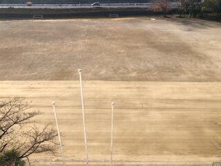 工事用車輌の通路だった校庭の端も転圧が終わり、まっ平になりました。