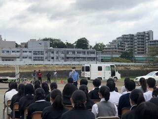 スタントマン・スタントウーマン、多摩中央署,多摩市役所のご支援で久しぶりの全校行事となりました。被害者にも加害者にもならないようにとお話しや実演で交通安全を学びました。