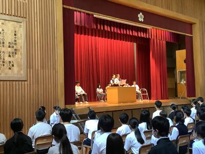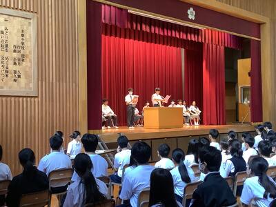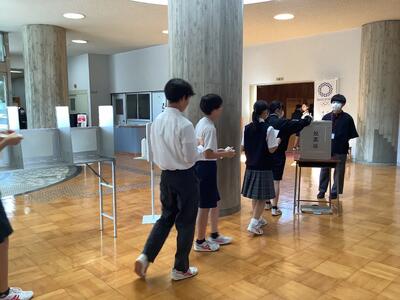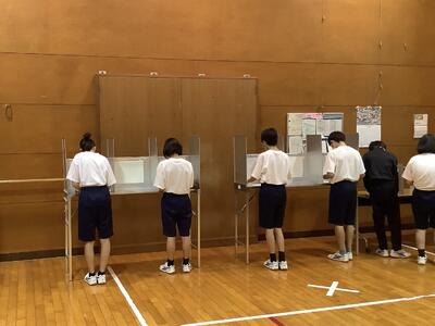 5年度後期から6年度前期を任期にした生徒会役員選出のための立会演説会と投票がありました。現生徒会長からの呼びかけに続き、10人の候補者がそれぞれの思いをスピーチに込めました。演説の後は、正式な記載台を使用して投票が行われました。