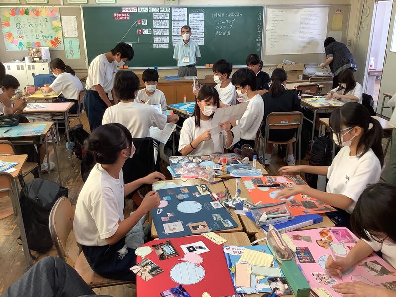 一年生のキャリア教育の一環として、講師の方々に来ていただいて「ドリームマップ」の作成を行いました。まず、講師の方から夢に対する考え方やマップの作成方法について学びました。その後は、それぞれに今自分が興味を持っていることや好きなことを中心にして、写真などを使いながら自らのドリームマップを仕上げました。