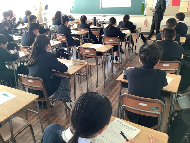また、3年生は修学旅行のまとめの発表会を体育館で行いました。今日は、事前に各クラスで行われた発表会で決定したクラス代表班が発表を行いました。3年生とともに2年生も参加し、発表を聞きました。1組は校外学習の日程と重なったため、動画による参加となりました。2年生は、来年度の修学旅行の参考になったと思います。
