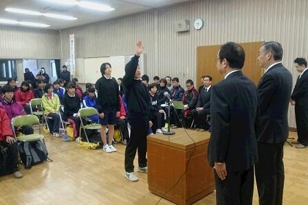 その中で、男子選手の代表として田野倉君、女子選手の代表として平井さんが、阿部多摩市長、清水教育長に向け、決意の言葉をりっぱに述べました。