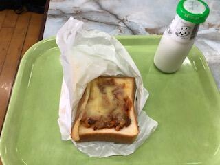 今日は大きな揚げパンです。牛乳ラベルに多摩市制50年のロゴが入っていますよ。