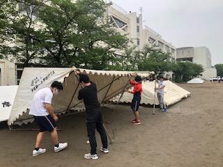 小雨の降る中、国士館大学や明星大学の教員志望の大学生の方々が、生徒用のテントを立ててくれています。