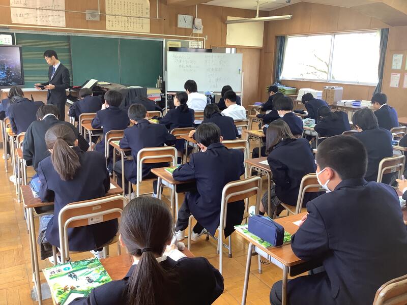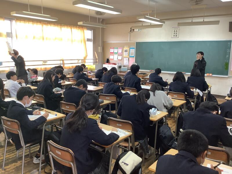 1年生の英語の時間では、リスニング問題に取り組んでいました。英文を聞き取り、内容に関する質問に答える練習でした。自分の考えを積極的に発表しようとする姿が多く見られました。