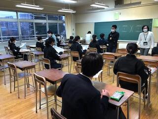 雪の降る中、漢字検定に挑戦する生徒。