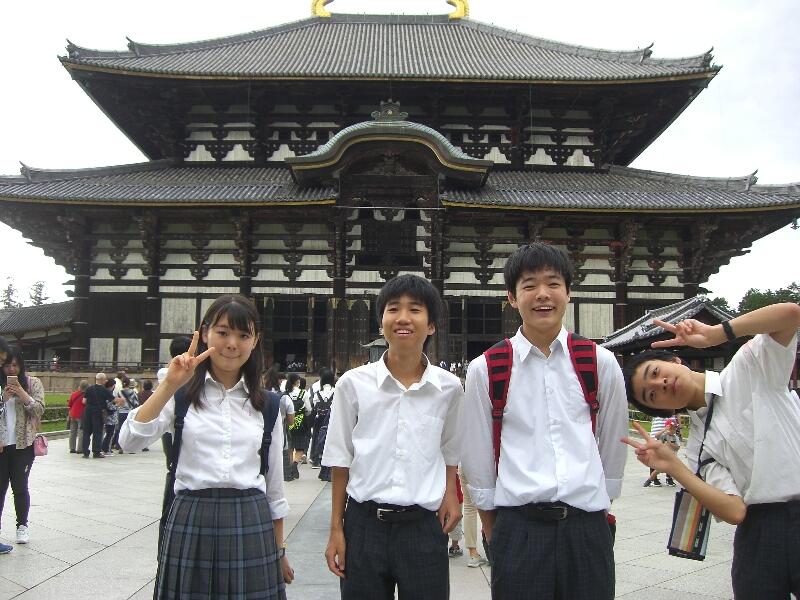 京都駅からはバスで、A・C組は宇治の平等院、B組は法隆寺、D・F組は薬師寺に向かいました。その後、全クラスが奈良公園に集まり、東大寺の大仏や興福寺、春日大社など見学し、奈良公園の鹿と戯れました。京都に戻り、大江能楽堂で能体験をしました。宿に着いてからは京風すき焼きをおなか一杯食べ、就寝までの時間、部屋や地下の大広間で楽しい時間を過ごしました。