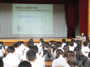 6月12日(金)の5時間目に、2学年の生徒が職場体験前マナー講習を受講しました。ハローワーク府中のジョブサポーターの萱沼重子さんをお招きして「マナーや仕事のこと」について学びました。短い時間の中で、マナーの意味について考えたり、「あいさつ」などを声に出したりと実践を織り交ぜながら、社会のマナーを身に付けていきました。
