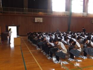 6月13日(土)3時間目、体育館で全校生徒と保護者、地域の方を対象にセーフティ教室を開催しました。講師にKDDIの松岡さんをお招きして、「ケイタイ・スマホでのトラブル・個人情報」をテーマに具体的なトラブル、犯罪事例などを紹介していただきました。また、「自分の軽率な行為がどのようなことを引き起こすのか」「事前の対策はどのようにすればよいか」など指導いただきました。全校生徒を代表して、生徒会長の馬場俊くんからお礼のことがありました。