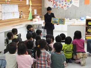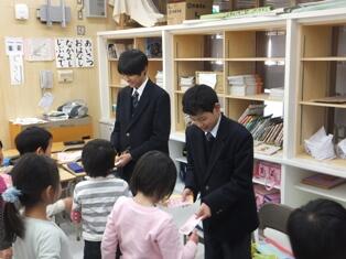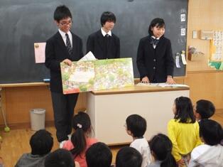 12月8日(火)の放課後から読む絵本を選び、読み聞かせの練習を重ねました。当日、多摩中の生徒はかなり緊張していました。教室にいくと小学生の皆さんが楽しみに待っており、大きな声で笑ったり一緒に声を出してくれたりと、目をキラキラさせながら聴いてくれました。3冊の絵本を読み終わると、アンコールの声があり、もっと絵本を読んでほしい様子でした。最後に手作りのしおりを小学1年生にプレゼントしました。