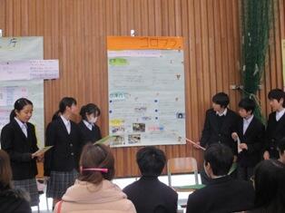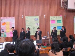 3月12日(金)5時間目に1学年の生徒が体育館で、11月に実施した職場訪問の発表会を行いました。訪問先で伺った話や質問した内容とその回答、体験した内容等を原稿にまとめ、クイズや実演などで構成しました。各班とも、7分間の持ち時間いっぱい、元気に発表しました。発表していない時は、他の班の発表を見学し、興味のある事業所について、お互いに学ぶことができました。