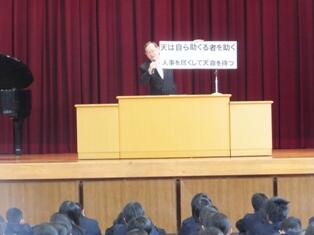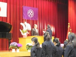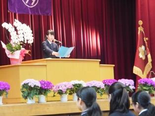 その後、始業式が行われ、宮島葵さん(3年B組)と小林智香さん(2年D組)が生徒代表で決意の言葉を発表しました。堂々と新学期への意欲を感じる発表で、これからの1年間が素晴らしいものとなることが期待されます。校長先生より「天は自ら助くる者を助く」とお話がありました。