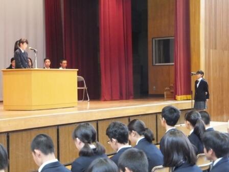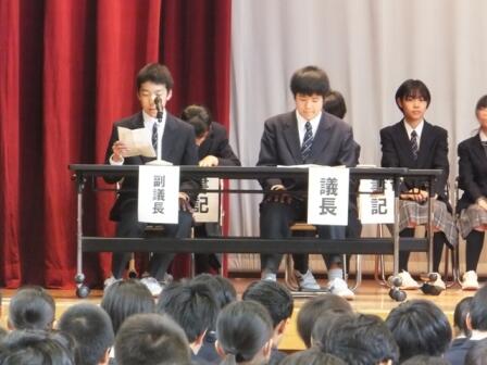 はじめに議長・丸島大輝くん(3A)、副議長・内藤健太くん(3B)、書記・宇野 雄一朗さん(2A)、柴田 彩佑香さん(2B)の4人が議長団の選出され、議長団の進行のもと、生徒会長・各委員会委員長から活動方針・活動内容が説明されました。