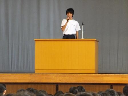 はじめに議長・丸島大輝くん(3A)、副議長・内藤健太くん(3B)、書記・宇野 雄一朗さん(2A)、柴田 彩佑香さん(2B)の4人が議長団の選出され、議長団の進行のもと、生徒会長・各委員会委員長から活動方針・活動内容が説明されました。