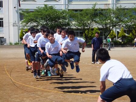 また、各学年で学年種目(1年ハリケーン、2年ムカデ競争、3年多人多脚)や縦割りブロック種目(大縄跳び)に取り組み、各クラスでお互いに励まし合いながら、今までの練習の成果を発揮していました。