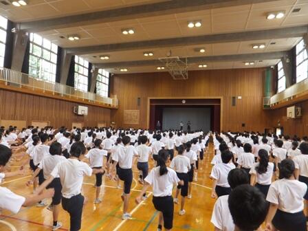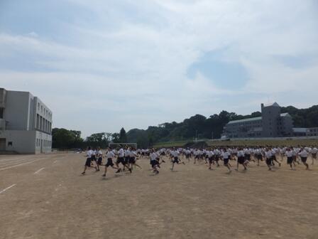 5月10日(火)2校時に第1回運動会練習を行いました。校長先生や岩渕先生そして体育行事実行委員長の三好紘暉くんと副実行委員長の小柴幸平くんより、運動会ヘ向けて「多摩中魂とは?」「普段の生活の重要性」「クラスの団結」など話がありました。また、全校生徒でラジオ体操の動きを確認をしました。