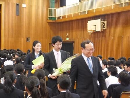 5月2日(月)6時間目に離任式が行われました。学級や部活動でお世話になった生徒から離任された先生にお別れの言葉と花束贈呈があり、感謝の想いを伝えました。また、先生方から多摩中の思い出や転出先での学校の様子などお話がありました。