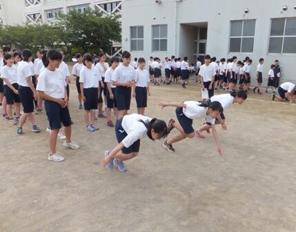 5月10日(火)2校時に第1回運動会練習を行いました。校長先生や岩渕先生そして体育行事実行委員長の三好紘暉くんと副実行委員長の小柴幸平くんより、運動会ヘ向けて「多摩中魂とは?」「普段の生活の重要性」「クラスの団結」など話がありました。また、全校生徒でラジオ体操の動きを確認をしました。