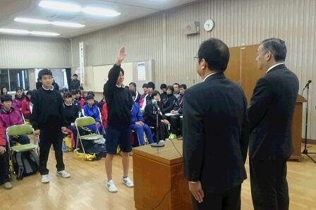 その中で、男子選手の代表として田野倉君、女子選手の代表として平井さんが、阿部多摩市長、清水教育長に向け、決意の言葉をりっぱに述べました。