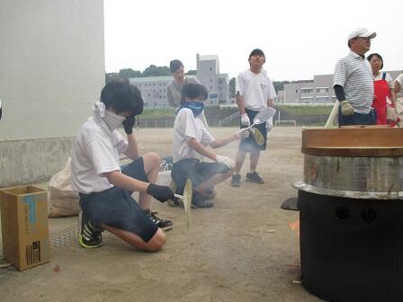 震災時の生活を想定し、避難所で自分たちがとるべき行動や態度、様々な防災講習から実践的な救命技術や防災の知識を学びました。夕食は、火起こしからはじめ、アルファ化米・豚汁を食べました。また、東日本大震災、阪神・淡路大震災についての講話を聞きました。夜は体育館と談話室に災害用の毛布とマットで就寝しました。