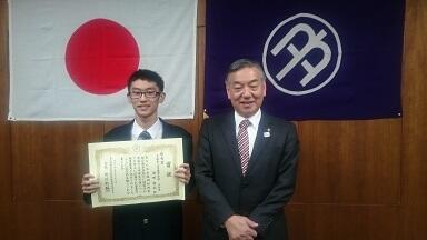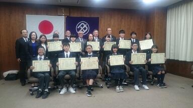 11月7日(火)、多摩市役所で中学生「税についての作文」多摩市表彰式が行われました。多摩中からは3年B組須田 智也君が「南多摩納税貯蓄組合連合会 優秀賞」に選ばれ、表彰されました。